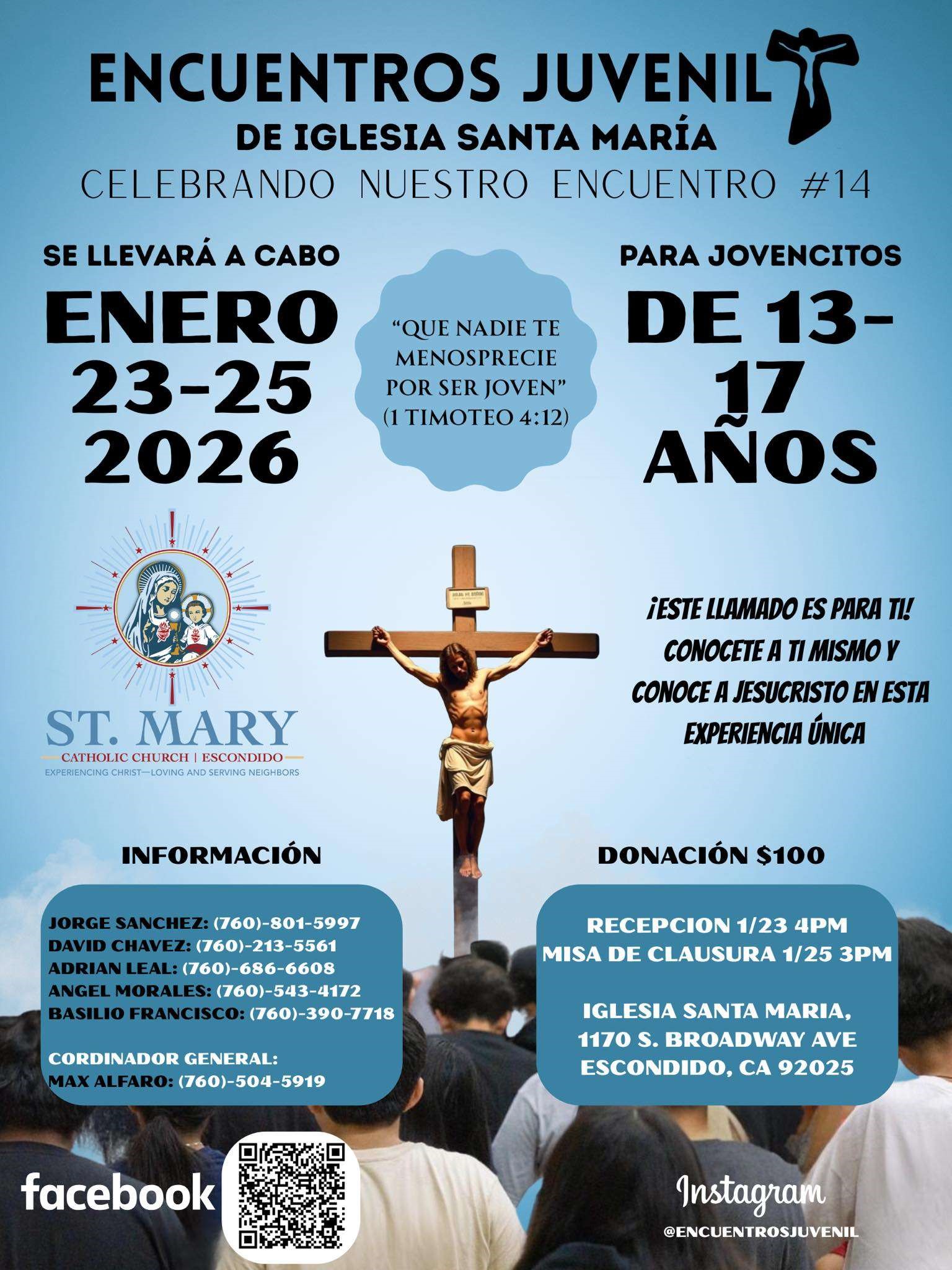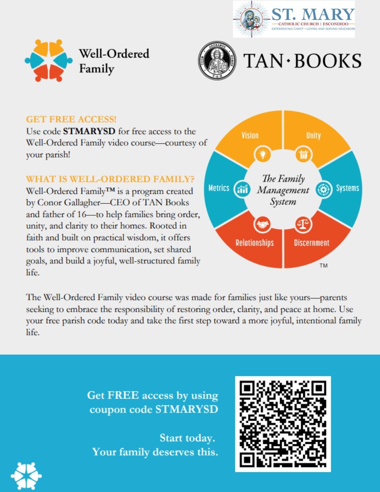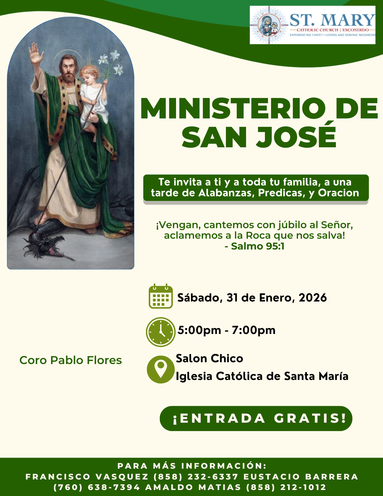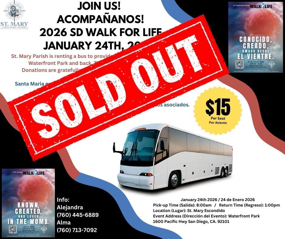 St. Mary Parish in Escondido, CA, welcomes everyone to enter God’s Covenant of love, forgiveness and healing and in turn follow His Will manifested in Revelation (Scripture, His life and Apostolic Tradition). As such, our Parish provides followers of Jesus Christ, who alone is Savior, the practice of Roman Catholicism witnessing in faith the one true God in the three persons of Father, Son and Holy Spirit. Initiated into the life of God through grace by baptism, we are brothers and sisters in the mystical body of Christ, united in professing the faith in One, Holy, Catholic and Apostolic Church established by Jesus and steadfast in our pursuit to know, love and serve God.